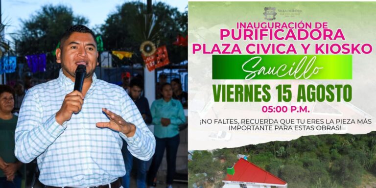 Purificadora de agua, kiosco y plaza cívica mejorarán la calidad de vida de la comunidad. El presidente municipal de Villa de Reyes, Ismael